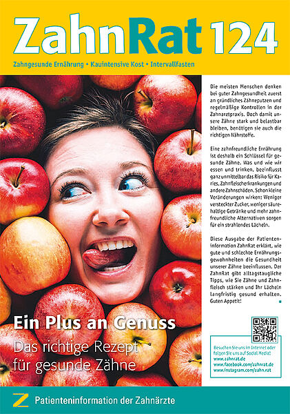 Der "ZahnRat" ist eine Patienteninformation zu zahnmedizinischen Themen in Form einer Zeitschrift. Jede Ausgabe enthält Tipps und Hinweise zu einem Thema der Mundgesundheit. Das gesamte Patienteninformationssystem ZahnRat umfasst die verschiedenen Ausgaben des Heftes sowie die Website mit einem Heftarchiv und Hinweisen zur Patientenberatung und Zahnarztsuche.